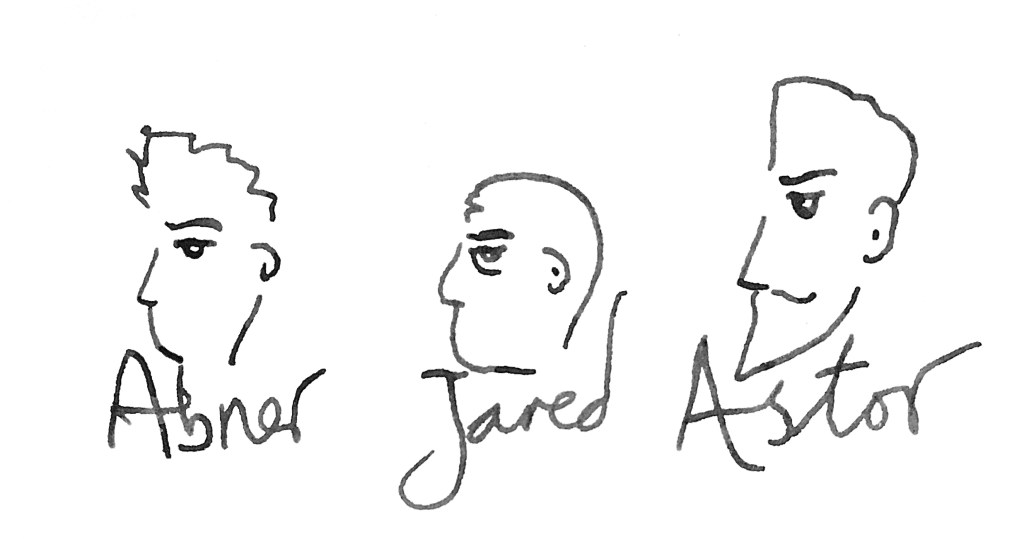 In the novel, I give almost no description of how the main characters look. This is deliberate. Growing up, I enjoyed stories that left much of a character’s appearance to my imagination. Above is the only image of the three main players, and even this is certainly not meant to be definitive! I doodled it early on, just to help me think of the characters. Astor was eventually renamed Silas, a name chosen because of the Elliot novel Silas Marner, which sounds like ‘mariner’, and because it is an anagram of ‘sails’. I also just like it!