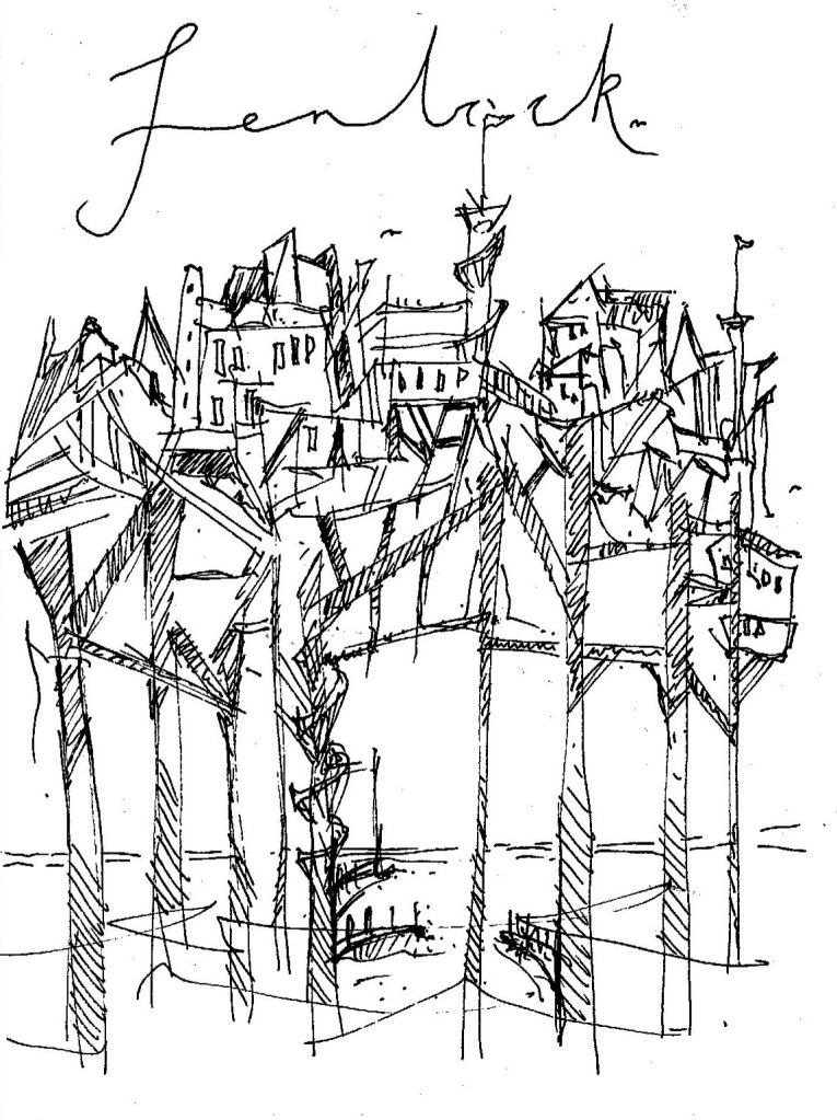 This is a sketch of the first rig in the novel, Fenlock. Abner and his crew find safety here during the opening storm. It is here, on Fenlock, that he discovers the fatal damage to his ship, and it is here that he meets Silas. Fenlock was, at one time, a fishing and sea-farming rig. Now, however, it makes a trade offering cheap lodgings to passing vessels. As such, it has a slight notoriety for rough roguishness. One of the roughest rogues on the rig is Molly, a proprietress and longstanding friend of Abner.